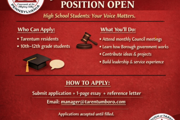 Tarentum Borough is now accepting applications for our Junior Council Person (JCP) seat for the upcoming school year. This is a unique opportunity for a local high school student to take an active role in Read more