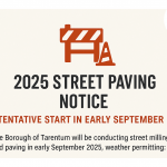 The Borough of Tarentum will be conducting street milling and paving in early September 2025, weather permitting. The following streets are scheduled for improvement: Summit Street – from 10th Avenue to 8th Avenue Fentzell Avenue – from Roup Street to 8th Avenue East 8th Avenue – from Ormond Street to