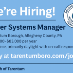 We’re Hiring – Help Reimagine Tarentum’s Water System! Tarentum Borough is seeking a motivated Water Systems Manager to lead operations at our water treatment plant and distribution system, with a willingness to train and develop the right individual into this leadership role. This new leadership role is a cornerstone of