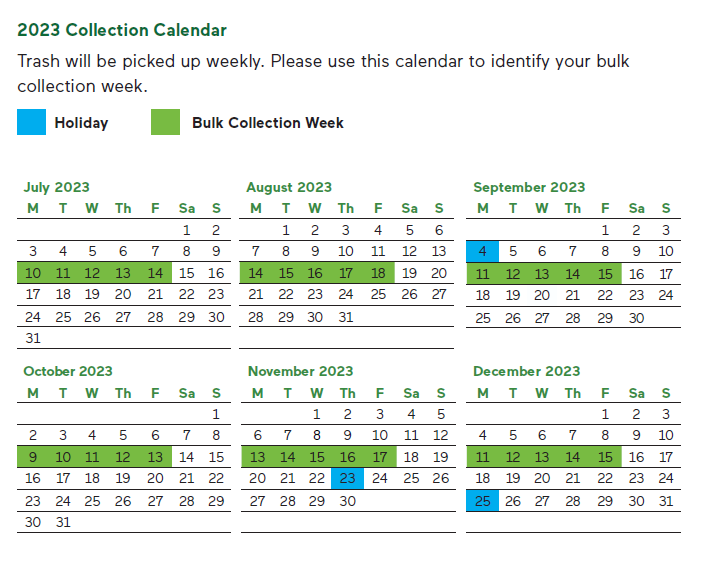 Collection and removal of solid waste shall occur weekly between the hours of 6:30 a.m. and 6:00 p.m., Monday through Friday, excluding holidays.Bulk Items and overflow Material